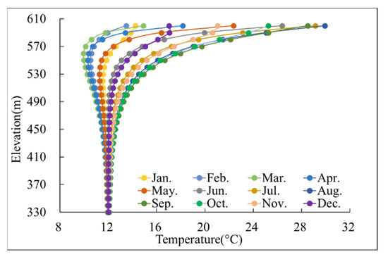 Both the part below the water level of the upstream surface of the dam and the surface of the foundation is affected by the water temperature, so the boundary condition of water temperature is taken. According to the monitoring results of the thermometer measuring points at the upstream surface of the No. 16 dam section from 2018 to 2020, it is calculated that the monthly average temperature distributes along the elevation, and the measured water temperature boundary conditions are obtained, as shown in Figure 8.