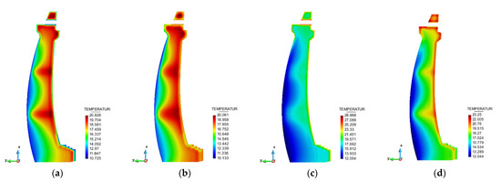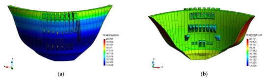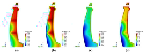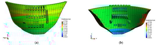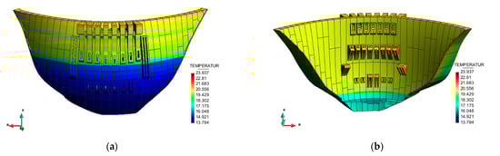 The surface temperature of the dam is mainly affected by the temperature boundary conditions. In this paper, only the cloud maps of the surface temperature of the arch dam under the actual condition are given. Figure 15, Figure 16, Figure 17 and Figure 18 are the cloud maps of the quasi-stable temperature field distribution of the dam in January, April, August and November under the actual condition. It can be seen that the dam surface temperature above the upstream water level of the arch dam is about 15~16 °C in January, 17 °C in April, 23~24 °C in August and 20 °C in November. The temperature below the water level decreases with the elevation decreasing, and it is about 13~14 °C near the dam bottom in January, April, August and November. The temperature distribution on the dam surface above the downstream water level is uniform, and it is about 14.5 °C in January, 17.5 °C in April, 24 °C in August and 20 °C in November.