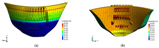 Cloud map of quasi-stable temperature field distribution of the dam in August (Unit: °C). (a) Upstream face; (b) Downstream surface.