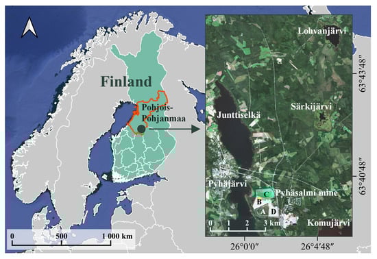 Pyhäsalmi Mine Oy is an operating Zn–Cu–S mine, located by Lake Pyhäjärvi [51]. There are four tailing ponds on the territory of the mine. Tailing pond A, with an area of 0.41 km, was decommissioned in October 1997. Tailings B and D, with an area of 0.31 km, contain pyrite concentrate. Tailing C, with an area of 0.47 km, is a sump and functions as a mine water basin. Treated wastewater is discharged into Lake Junttiselkä, which is part of Lake Pyhäjärvi [52,53].