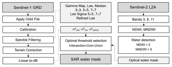 Any reference water mask derived from the data acquired at Sentinel-1 sensing time or in a short time interval (for example, aerial survey data) can be used instead of an optical mask. In this paper, the optical water masks were generated from Sentinel-2 NDWI and MNDWI spectral indices.