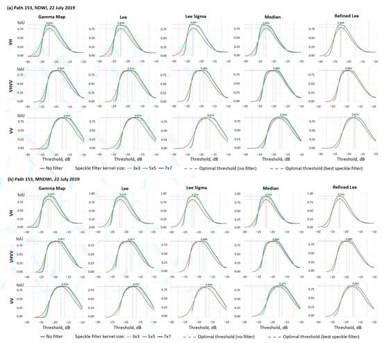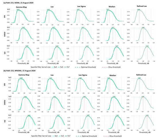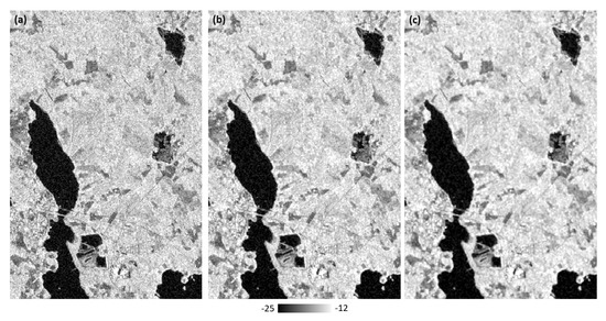 A characteristic feature of SAR data is the presence of speckle noise. It occurs due to signal interference reflected by various scatterers on the Earth’s surface. There is a wide variety of opinions in the literature regarding the best speckle filtering method, whether to perform the filtering at all, etc. At the same time, these technical points can have no less impact on the quality of water bodies identification than the choice of one method or another. In solving the problem of identifying water bodies, various speckle filtering methods are used: Lee, Lee Sigma, Refined Lee, Median, and Gamma Maximum A Posteriori (MAP) with kernel sizes from 3 × 3 to 7 × 7 [27,44,45,46,47,48,49].