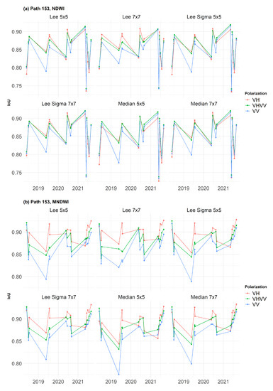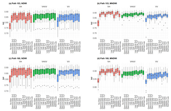SAR data pre-processing chains are described in more detail by Filipponi and McVittie [60,61]. The “S1 Remove GRD Border Noise” operation was not executed because the study area subset did not hit the swath border. Processing sequences without “S1 Thermal Noise Removal” and with different types of speckle filters and kernel sizes were investigated. Speckle filtering was performed using the masks of the filters most frequently presented in the papers, such as Gamma Map; Median; Lee with kernel sizes 3 × 3, 5 × 5, and 7 × 7; Lee Sigma with kernel sizes 5 × 5 and 7 × 7; and Refined Lee [27,47,49].