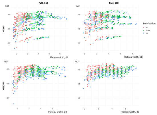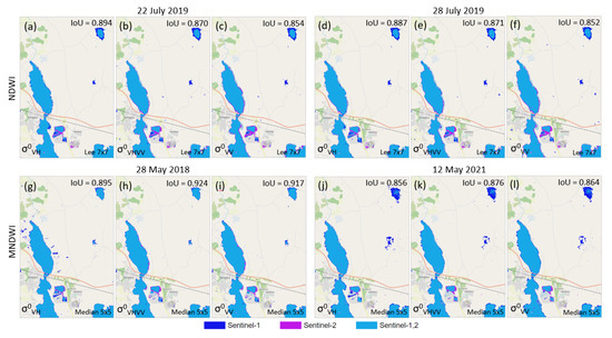 The IoU-similarity values providing an acceptable quality of water SAR masks are investigated below. Figure 3 shows SAR masks with different similarities to the reference mask. The worst water SAR mask (Figure 3a) has a similarity IoU = 0.659 (MNDWI-based reference mask). This mask was generated from the image acquired on 23 May 2019 (path 153) in VV polarization, without speckle filtering. The maximum similarity IoU = 0.941 has a SAR mask generated from the image acquired on 28 August 2021 (path 160, speckle filtering: Median 7 × 7), in the VH polarization (MNDWI-based reference mask) (Figure 3d). The reference optical and resulting SAR mask intersection areas are in blue in Figure 3.