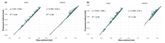 Binary similarity measures are used for quantifying affinity of two or more pixel sets of the same class by calculating the ratios of union and intersection of their elements or areas. In the case of water masks, pixels of the “water” class and areas of water bodies are subject to comparison. Similarity coefficients include the Jaccard Index (intersection over union—IoU), Braun–Blanquet coefficient, Sørensen–Dice coefficient, etc. [70].