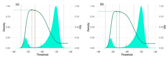 There are various approaches to determine the threshold, in particular, the Otsu and Kittler–Illingworth methods [34]. Otsu’s method of automatically determining the global threshold, proposed by Nobuyuki Otsu in 1979 [33], is based on the assumption that class balance is kept and the histogram is bimodal. The mode of low values corresponds to the “water” class pixels and the mode of high values corresponds to the “land” class pixels. The class-separating threshold corresponds to the local minimum between the two modes and maximizes the interclass dispersion .