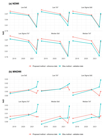The possibility of water body detection from multispectral satellite images derives from the fact that an increase in surface moisture is associated with a reflectance decrease in the visible, near-infrared (NIR), and, above all, shortwave infra-red (SWIR) ranges of the electromagnetic spectrum [62]. The normalized differences of reflection coefficients enable the identification of water bodies that are distinguishable on satellite images due to their spectral properties in the visible and infra-red ranges of the electromagnetic spectrum. Two of the best-known and frequently used spectral indices are the normalized difference water index (NDWI) [7] and modified normalized difference water index (MNDWI) [8].