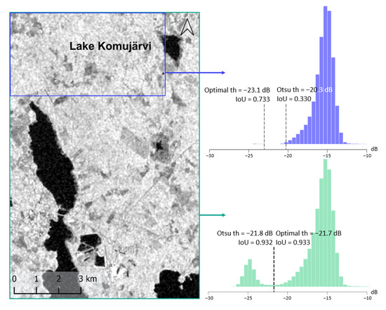 - Kavats, O.; Khramov, D.; Sergieieva, K.; Puputti, J.; Joutsenvaar, J.; Kotavaara, O. Optimal Threshold Selection for Water Bodies Mapping from Sentinel-1 Images based on Sentinel-2 Water Masks. In Proceedings of the IGARSS 2022–2022 IEEE International Geoscience and Remote Sensing Symposium, Kuala Lumpur, Malaysia, 17–22 July 2022; pp. 5551–5554. [Google Scholar]
