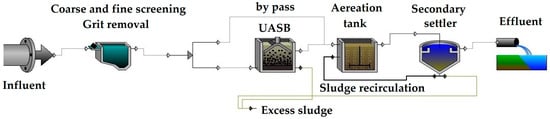According to [14], the combined UASB + activated sludge system (UASB-AS) produces less sludge and has lower energy consumption than the conventional activated sludge technology. At the same time, [15] showed that this system has a more stable effluent quality than other systems for the chemical oxygen demand (COD), biochemical oxygen demand (BOD), and total suspended solid (TSS) removal. Taking this into account, this combination is appropriate for the sewage treatment of particulates, soluble organic matter removal, and, in some cases, a satisfactory nitrification level.