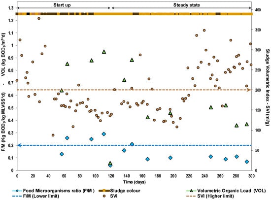 Figure 2 shows details of the F/M, VOL, SVI, and sludge color variation in the aeration tank during the start-up and steady-state phases. The sludge color is a good indicator of the process stability; this qualitative evaluation parameter is very useful as a fast method for making decisions during the aeration tank operation [38,39]. The STP operators were instructed to tune the operation parameters according to their visual observation as described below:
