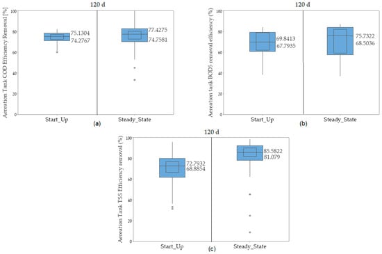 Aeration tank removal efficiency during start-up and steady-state operation: (a) COD, (b) BOD, and (c) TSS. ∗: boxplot outliers.