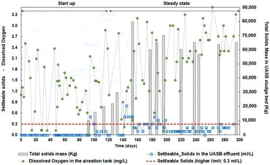 In the steady-state phase, the average removal efficiencies were as follows: COD (77 +/− 12); BOD (76+/− 17); TSS (81 +/− 18). In both phases, the low efficiencies were related to the UASB effluent settleable solid concentration, which was higher than 0.3 mL/L. Figure 4 shows the variation in the UASB effluent settleable solid concentration, the total solid mass in the UASB sludge blanket, and the dissolved oxygen concentration in the aeration tank during the start-up and steady-state operation of the combined system.