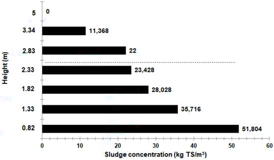 The UASB start-up without an inoculum was completed in 4 months (120 days), despite the wastewater temperature corresponding to psychrophilic conditions (minimum 17.6 °C, maximum 19.6 °C). The average effluent pH was 7.0 +/− 0.3. At this time, the sludge profile showed that the UASB maximum sludge storage capacity in the digestion zone was 60-ton TS (average concentration: 38 kg TS/m3). Figure 5 shows the UASB sludge bed profile after 300 days of the operation period. A clear distinction can be seen between the sludge bed and the sludge blanket, which is an indication of the good sludge quality [32]. In this case, 83% of the sludge mass was in the sludge bed.
