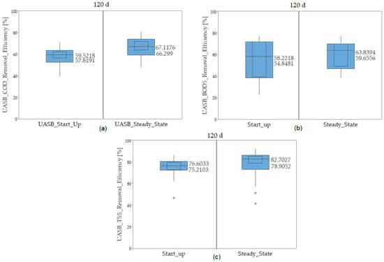 Removal efficiencies in the UASB reactor during the start-up and steady state: (a) COD, (b) BOD, and (c) TSS. ∗: boxplot outlier.