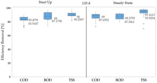 COD, BOD, and TSS STP removal efficiencies during the start-up and steady state. *: boxplot outliers.