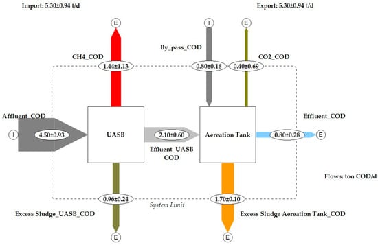 The steady-state COD balance at the end of the evaluation period was built with the free STAN software [43]. This is a tool for material flow analysis of goods, substances, and energy that allows the user to calculate the unknown flows considering data uncertainties through error propagation. In this case, the unknown values were the amounts of influent COD converted to methane in the UASB reactor and to CO2 in the aerobic reactor. The other flow values with their uncertainties were measured.