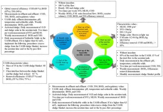 The results of this investigation allow us to establish recommendations for the start-up of these combined sewage treatments. Moreover, it was possible to define the operational limits and the key monitoring parameters for the successful start-up of the system, as shown in Figure 9.