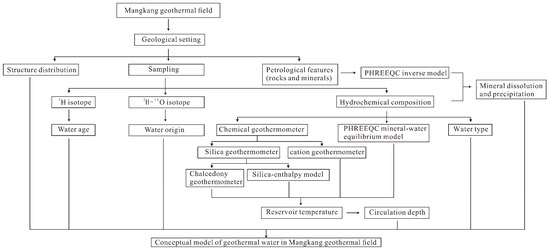 - This study comprehensively analyzed the hydrogeochemical characteristics, temperature, and depth of geothermal reservoirs and the water–rock interaction process in the Mangkang geothermal field in Tibet, China. The conceptual model established based on the analytical results can promote the understanding of the genesis of deep geothermal resources in Tibet. Moreover, this study may serve as a guide for future drilling in the Mangkang geothermal field.