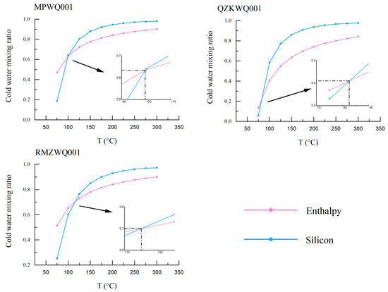 - Based on mineral–water solubility equilibrium, the hot springs in Meipu village, Qvzika village, Rumei town, and Zulongpu village have reservoir temperatures of 123–130 °C, 121–130 °C, 116–121 °C, and 47 °C, respectively. The silica-enthalpy model revealed that the geothermal water in Meipu village and Rumei town mixes with cold water, with mixing ratios of 63% and 70%, respectively.