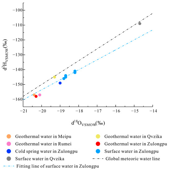 - The 2H and 18O isotopic analyses revealed the meteoric origin of the geothermal water. Based on the isotopic composition, the geothermal water in Meipu village, Rumei town, and Zulongpu village was found to share very similar recharge elevations (47000–4900 m), while the geothermal water in Qvzika village has the lowest recharge elevation (4400 m).
