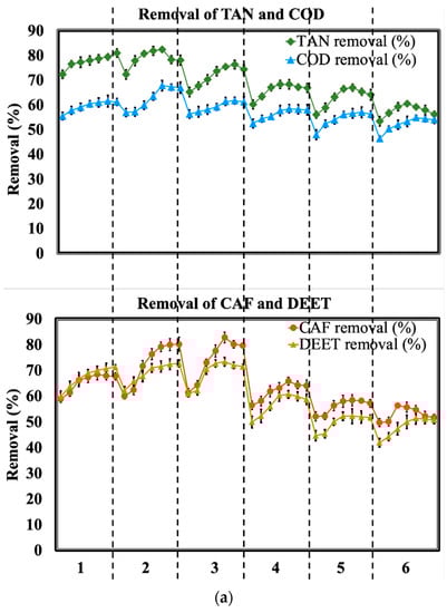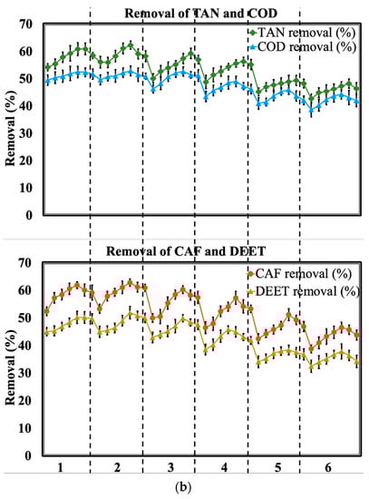 Based on the measurement of contaminants concentrations, the abatement efficiency of COD, TAN, DEET, and CAF was calculated by Equation (1):