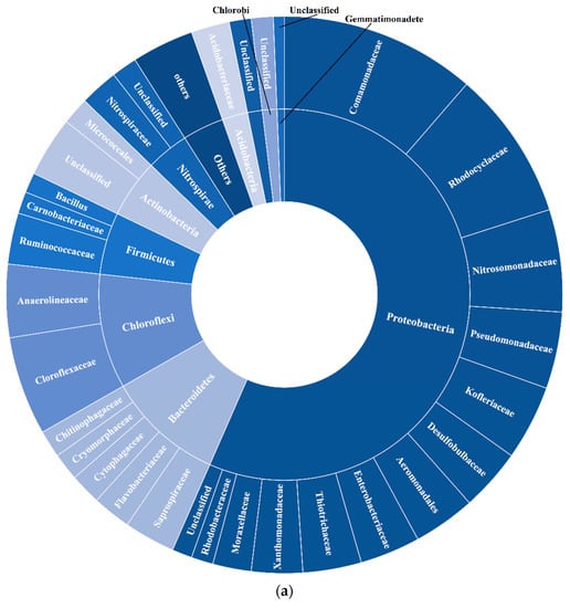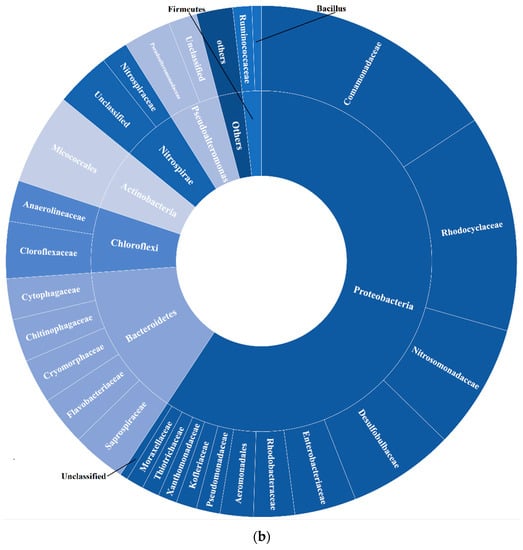 Based on Figure 2a, the dominant bacteria were Proteobacteria, Bacteroidetes, and Chloroflexi in the activated sludge, which are the same as with a study reported by Zhang et al. []. In the co-culture of activated sludge and microalgae, after running the experiments, the microbial communities can be changed []; therefore, the microbial community was monitored in reactor 1 after experiments. Based on Figure 2b, the Protobacteria, Bacteroidetes, and Chloroflexi were still dominant phyla after experiments; however, the percentage of Protobacteria was increased, while the percentage of Bacteroidetes and Chloroflexi was decreased. In comparison with the activated sludge (Figure 2a), the Actinobacteria community was significantly increased, which is in line with findings by []. This may relate to the light conditions. Maresca et al. [] stated that Actinobacteria grew faster in the presence of light, because the transport of sugar and metabolism were upregulated. Moreover, Comamonadaceae, Desulfobulbaceae, and Rhodobacteraceae were increased after experiments due to better aerobic conditions and the supply of oxygen by microalgae.