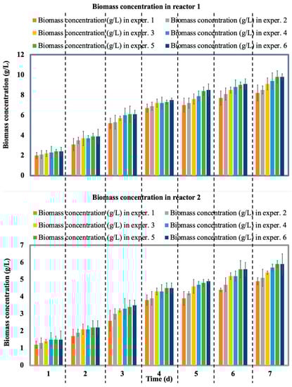 As shown in Figure 3, the biomass concentration in reactor 1 was much greater than in reactor 2, which is consistent with the findings of Berthold et al. [].