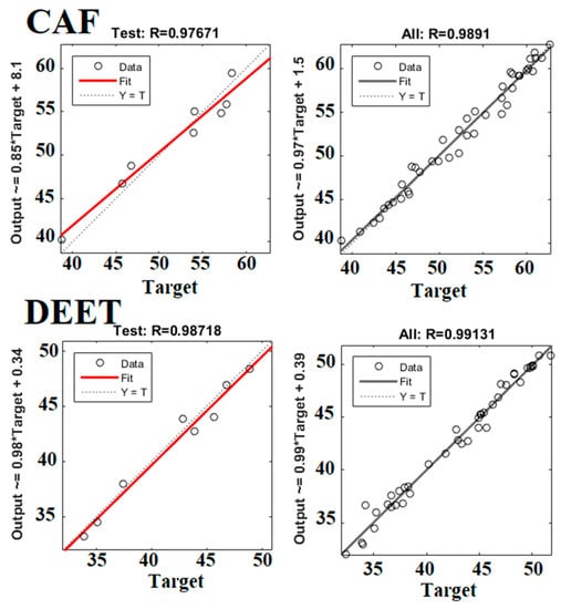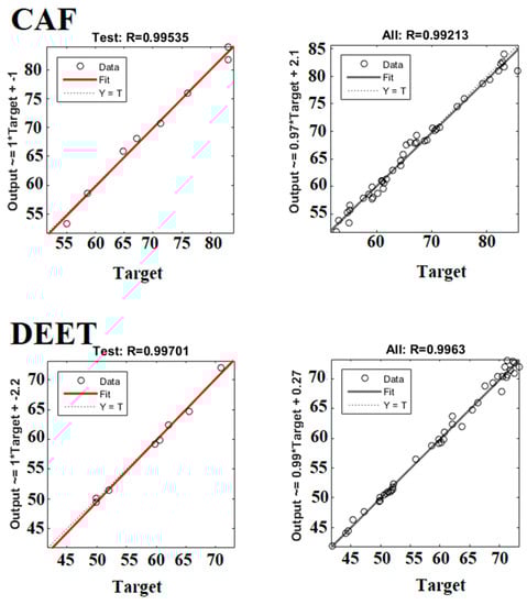 Once the contaminants were being removed by the two reactors, the removal optimization of both reactors was conducted by the ANN. Two neurons in the input layer were contact time (h) and the initial concentration of PPCPs (mg/L), while there were five neurons in the hidden layer, and removal (%) of CAF and DEET was the output layer. For developing a model via an ANN, training is the most vital step; therefore, 60% of data were clustered in the training step. The analysis of linear regression between the anticipated and experimental abatement data for CAF and DEET was conducted to evaluate the network efficiency []. For the removal of CAF and DEET by the first reactor, the experimental values versus the model prediction for the optimum topology for training, validation, and test data are presented in Figure 4. A high R2 value (0.99 for CAF and DEET) denotes the reliability of the model. Kassahun et al. [] stated that the high R2 value can confirm that the ANN topology exhibits a good estimate and possesses an appropriate generalization capability in order to predict the degradation efficiency under different operating conditions. The values of MSE were obtained by the LM training algorithm after 6 and 8 epochs (Figure S1) for the removal of CAF and DEET, respectively.