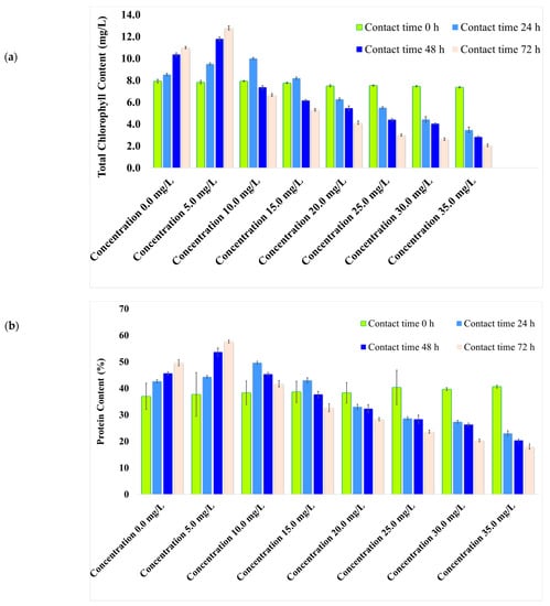 The combined impact of CAF and DEET on Chlorella vulgaris has not been widely reported in previous studies. Thus, water polluted with both CAF and DEET (0–35 mg/L) was used in this study. As indicated in Figure 6, the content of chlorophyll and protein increased with increasing PPCPs concentration, up to 5.0–10.0 mg/L. Then, the protein and chlorophyll were dramatically decreased by further increasing exposure time (contact time) and PPCP concentration. Low concentrations of emerging contaminants increased chlorophyll and protein content, due to the increase in enzyme synthesis or other energy-producing fractions []. However, a high concentration of PPCPs can negatively affect photosynthesis of Chlorella pyrenoidosa []. Moreover, the longer period of exposure to emerging contaminants negatively influenced the growth and cellular response of Chlorella sp. []. In addition, a high concentration of emerging contaminants may result in a decrease in the assimilation of CO2 by affecting the photosynthetic carbon-reduction-cycle enzymes [].