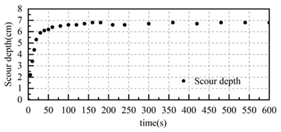 Figure 4 shows the local scour characteristics around a single pier without protection, with a local scour depth of 7.1 cm. The relationship between the local scour depth in front of the pier and time is shown in Figure 5. The development of local scour depth in front of the pier is consistent with the existing research. The process reached to the scour equilibrium within 600 s. So, the time of the model test in this study was set to 60 min to make sure later experiments can reach to the scour equilibrium.