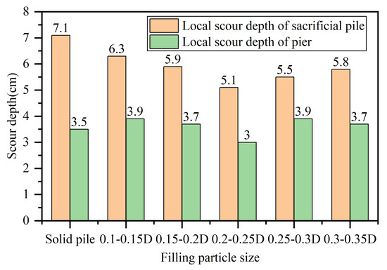 Local scour around the pier protected by permeable sacrificial pile with different particle sizes.
