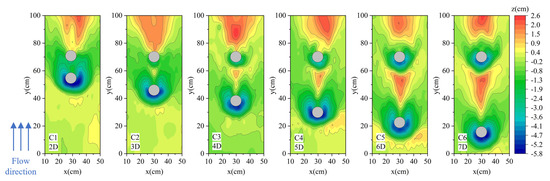 Figure 8 shows the local scour topography around the pier and permeable sacrificial pile filled with gravel size of 0.2–0.25 D at different layout distances. The layout distance from C1 to C6 was 2.0 D, 3.0 D, 4.0 D, 5.0 D, 6.0 D and 7.0 D, respectively. When the layout distance is less than 3.0 D, the scour holes around the permeable sacrificial pile and pier joined together, and there is barely any sediment siltation behind the permeable sacrificial pile. When the distance is greater than 3.0 D, the local scour holes around the pile and pier depart from each other, and the local scour depth around the piers becomes greater. However, if the layout distance keeps on increasing, the local scour depth and range of the permeable sacrificial pile would finally remain stable.