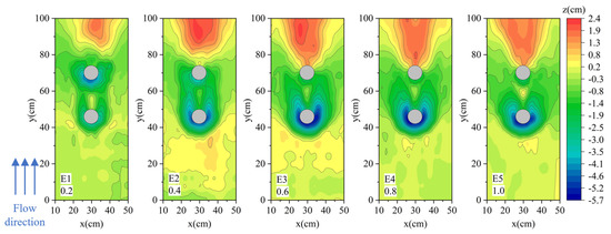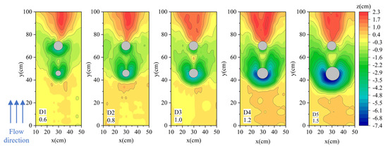 Figure 10 shows the topography of local scour around the permeable sacrificial pile and the pier in different diameter ratios (D1/D). From D1–D5, the diameter ratio was 0.6, 0.8, 1.0, 1.2, and 1.5, respectively. The gravel size was 0.2–0.25 D and the layout distance was 3.0 D. It can be seen from Figure 10 that with the increase of diameter ratio, the area of sediment siltation behind the permeable pile becomes larger and larger, and the local scour depth and range of piers decrease gradually. However, the scour depth and range of permeable sacrificial pile increase gradually.