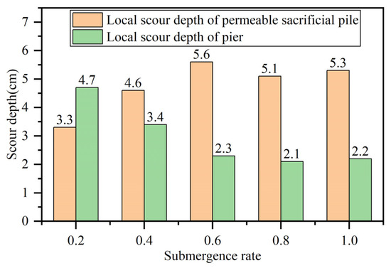 Local scour depths around the pier and permeable sacrificial pile with different submergence rates.