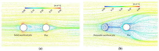 The RNG k−ε model was adopted in the simulation and CFD Post was used for post-processing to obtain the final numerical simulation results. Figure 16 shows the velocity vector and streamlines of the flow field 0.05 m above the riverbed. Figure 16a shows the flow field of experiment A, and Figure 16b shows that of experiment C2. From Figure 16a, the characteristics of the flow field around the solid sacrificial pile and the pier are in good agreement with existing research results, including the lower-speed flow in front of the pile and pier, higher-speed flow on both sides of the sacrificial pile and pier, and lower-speed area and vortex behind them. The shielding of the sacrificial pile plays an important role in reducing the local scour depth of the pier. The higher-speed flow around both sides of the pier is significantly smaller than that on both sides of the solid sacrificial pile because of the shielding effect.