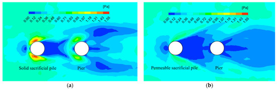 Figure 16b shows the flow field of experiment C2. Because of the permeability of the sacrificial piles, part of the water flows through the permeable piles at a lower speed, which reduces the amount and the velocity of downward flow in front of the pile significantly. Therefore, the local scour depth in front of the permeable sacrificial pile decreases. Meanwhile, as shown in Figure 17, because of the difference in the pressure in front of and inside the permeable sacrificial pile, the water flows outward the pile in the direction that is perpendicular to the isobars, which causes a weakness of the flow velocity around the pile, especially in the higher velocity area compared with that in experiment A. Meanwhile, the conflict of water from inside and outside the permeable pile enlarges the low-velocity area around the pile comparing to experiment A, which expands the lower-velocity area around the pier indirectly. Therefore, the expansion of lower speed area behind the permeable sacrificial pile and around the pier has a significant effect on the scour reduction in the downstream area, especially around the pier. This is in good agreement with the experiments results in Section 3.2.