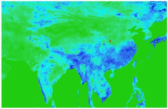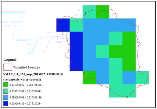 SMAP is an L-band satellite that can be used to observe soil moisture, launched by the National Aeronautics and Space Administration (NASA) in 2015 []. It has a combination of active and passive microwave sensors. Although the SMAP active radar is no longer available, its radiometer still provides highly accurate observations that can acquire surface 5 cm soil moisture data at spatial resolutions of 3 km, 10 km, and 40 km, and temporal resolutions of 1 to 3 days []. As the latest soil moisture monitoring satellite in orbit, the global soil moisture information provided by SMAP will make an important contribution to hydrometeorological studies and flood and drought prediction. The soil moisture data used in this paper were from the SMAP L4 product, which provides global 3-hour 9-km surface 5 cm soil moisture based on EASE-Grid 2.0. The global soil moisture data downloaded from the SMAP official website (Figure 2) were imported into ArcGIS for batch cropping to generate the corresponding raster data for the watershed above Chaiping (Figure 3), and the average soil moisture values of the watershed at each time were extracted as the data used for this assimilation.