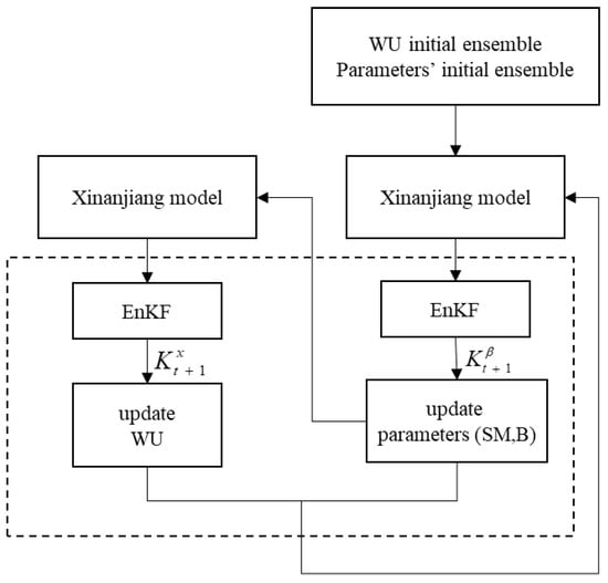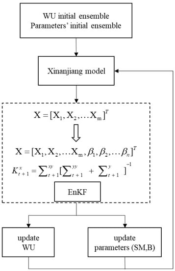 In this section, the original single-state variable WU was represented as a multi-state variable after adding the parameters. B as the soil storage capacity curve index. The observed data were SMAP remote sensing soil moisture data, and the corresponding operator was . Generally, the value of observation error variance is 5% to 10% of the observed value, while the initial error variance tends to be higher due to the initial conditions are uncertain []. Thus, the observation error variance was set as 1, which was about 7% of the observed value, and the initial error variance was empirically set as 5, which was large enough to account for their uncertainties. The mean value of the WU initial ensemble was taken as the observed soil moisture at the initial moment to generate the background. For parameters B and SM, the mean values of the initial background ensemble were taken as the calibration value of SCE-UA, and the variances were taken as 0.12 and 102, i.e., and , respectively. During the model operation, WU and parameters B and SM of the Xinanjiang model were updated as a continuous forward filter. For comparison with the scheme of assimilating WU, other settings remained unchanged and the number of ensemble samples was still 200. The flow of the AEnKF algorithm is shown in Figure 4.