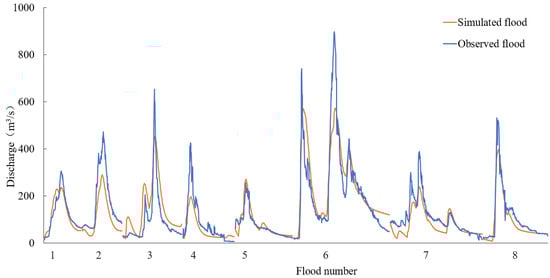 As can be seen from Table 6, the Xinanjiang model had applicability in the Xun River, and the floods simulated by this set of parameters fit well with actual floods. In the calibration period, the overall flood peak error and NSE of the simulated floods were 0.15 and 0.839, respectively, among which the flood peak error of 13 floods was within 0.2, and the peak time difference of more than half the floods was controlled within 3 h. The NSE of all floods was above 0.7, and the NSE of simulated floods closest to the measured flood was as high as 0.943.