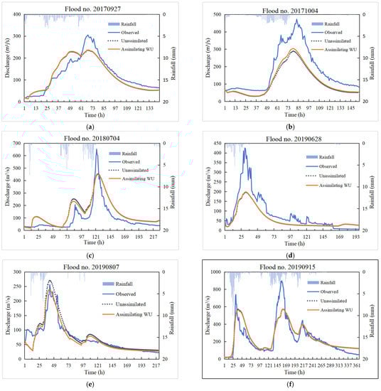 On the whole, flood no. 20170927, flood no. 20190807, flood no. 20190915 and flood no. 20210424 still performed well in flood simulation, and NSEs reached above 0.8. Combined with the results of the WU assimilation scheme, it was seen that the dual ensemble Kalman filter method effectively improved the accuracy of flood prediction by simultaneously assimilating parameters and WU.