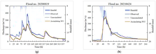 On the whole, flood no. 20170927, flood no. 20190807, flood no. 20190915 and flood no. 20210424 performed well in flood simulation, and their NSEs reached above 0.8. The results showed that assimilating WU and model parameters SM and B by state variables expansion had a positive effect on the improvement of flood prediction accuracy.