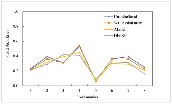Using the data in Table 10 to draw Figure 8, it can also be visually concluded that the flood peak errors, when assimilating parameters and WU simultaneously, were reduced to different degrees, compared with both unassimilated and WU assimilation. WU assimilation had little effect on flood peak error. The schemes with assimilating parameters reduced flood peak error and had a better assimilation effect. In general, the data assimilation method reduced the error of flood peak prediction, and the Xinanjiang model with simultaneous assimilation of parameters and state variables was better in flood peak prediction.