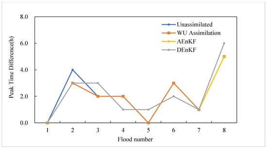 Using the data in Table 11 to draw Figure 9, it can also be seen visually that with the addition of the parameter assimilation, the peak time difference of the AEnKF scheme was reduced in four and two floods, respectively, compared with those unassimilated and WU assimilation. The peak time difference of the DEnKF scheme compared with that of unassimilated and assimilating WU decreased in three and two floods, and both decreased by 1 h. In general, data assimilation predicted flood peak time closer to the actual situation.