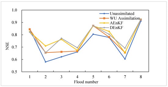Through the NSE statistics of each scheme for each flood, it can be seen from Table 12 that the average NSE of the four simulation schemes, from large to small, were: AEnKF, DEnKF, WU assimilation and unassimilated. It proved that considering parameters and WU assimilation at the same time improved the accuracy of flood simulation. Compared with the unassimilated scheme, the overall NSE improved by 3.3% after assimilating WU. The NSE of flood no. 20171004 and flood no. 20190807 increased by 7.5% and 6.8%, respectively. Compared with the unassimilated and WU assimilation, the average NSE of eight floods in the AEnKF scheme increased by 5.6% and 2.3%, respectively, and those in DenKF increased by 5.4% and 2.1%, respectively. Compared with WU assimilation, the number of floods with NSE above 0.7 after adding parameters assimilation increased by two and one, respectively. For flood no. 20180704, NSE improved the most after considering parameters assimilation, with AEnKF increasing the NSE by 14.1% compared with unassimilated, by 10.1% compared with WU assimilation, and the DEnKF increasing NSE by 15% compared with unassimilated and by 11% compared with WU assimilation.