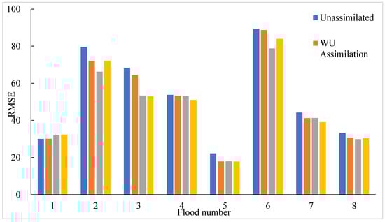 In this paper, the results of the above four simulation schemes were compared with the measured runoff data. The RMSE of runoff in each flood was counted, as shown in Table 13. Except that the RMSE of flood no. 20170927 increased slightly in the two schemes of assimilating parameters and WU, the RMSE of the other floods decreased to different degrees compared with WU assimilation. The overall RMSE from large to small was: unassimilated, assimilated WU, DEnKF and AEnKF scheme.