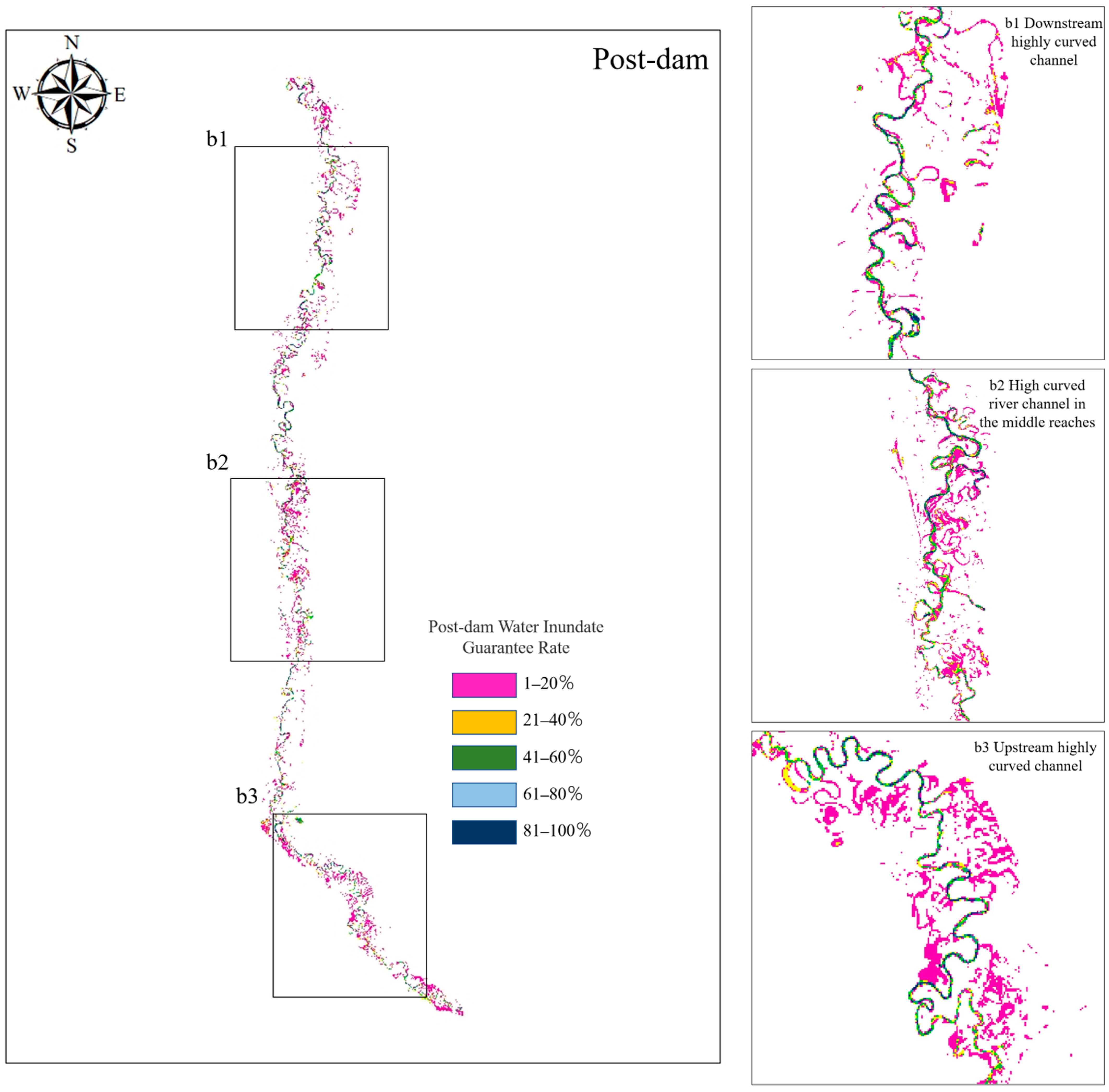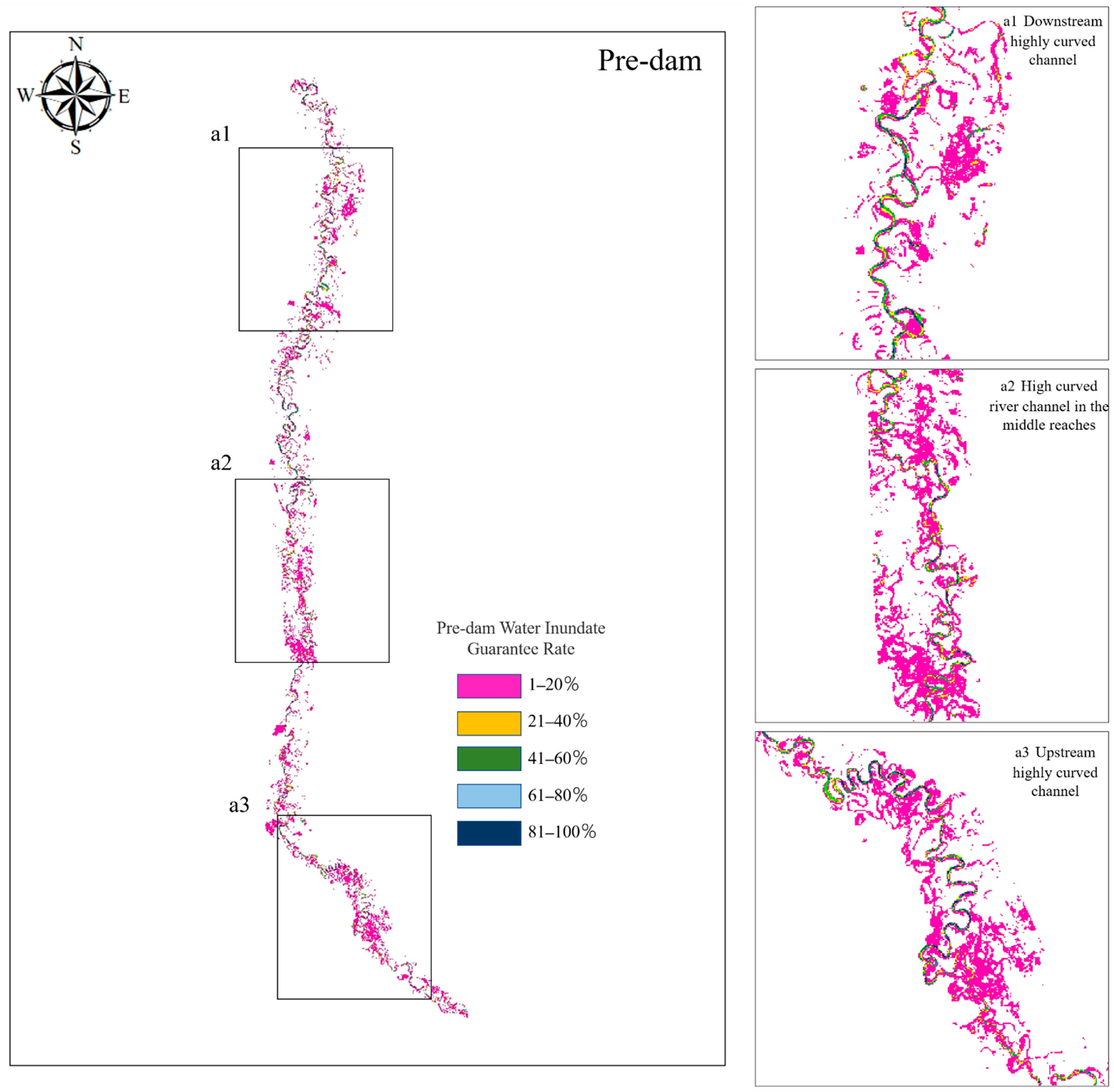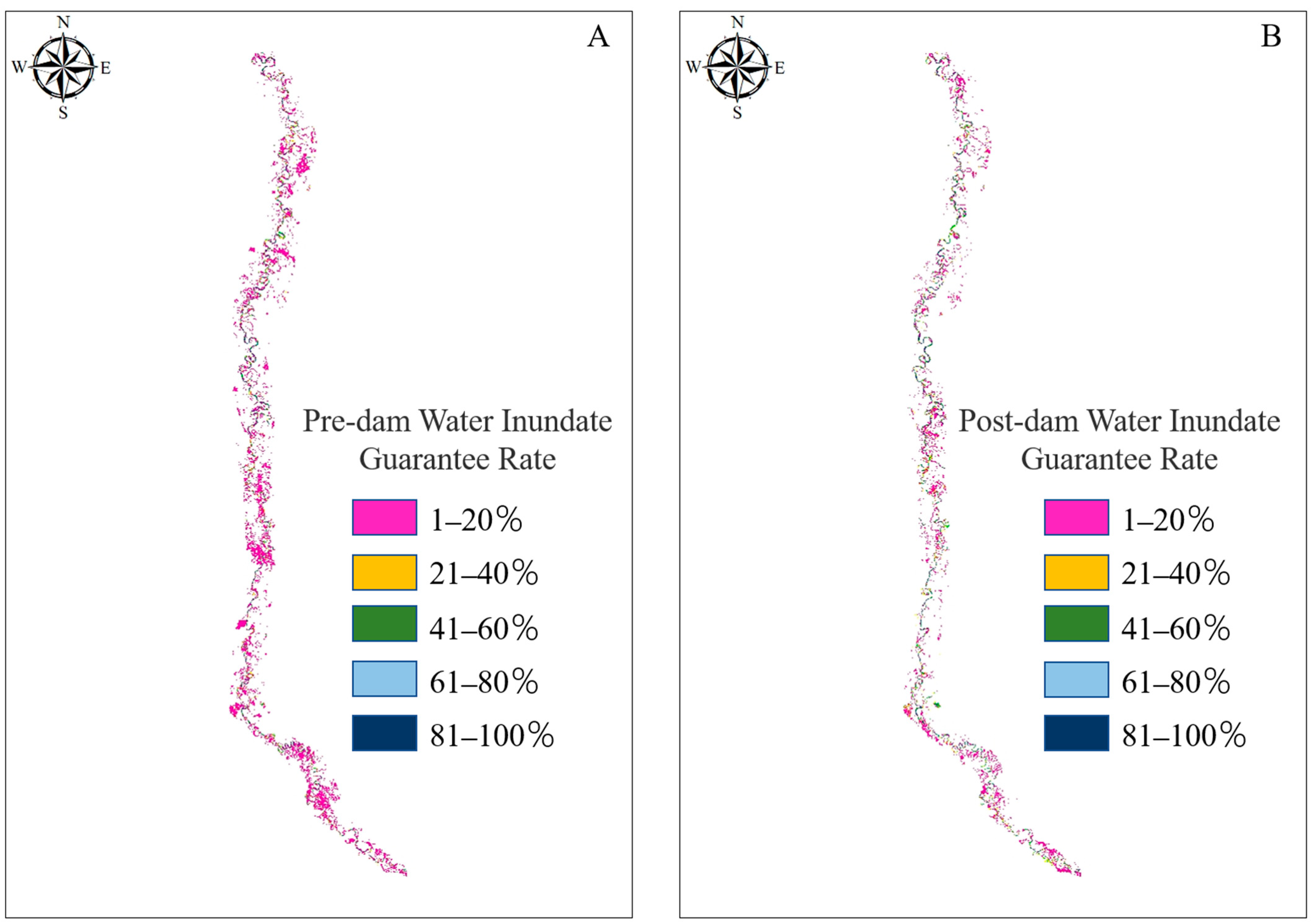 - The construction of the reservoir reduces the flow loss and the exchange of lateral water bodies, resulting in a negative impact on the hydrological status of the floodplain wetland, the area of the floodplain outside the river channel is reduced, the hydrological situation in the river channel has changed due to the influence of the dam, and the reservoir has changed. A regulated base flow or low flow will increase its inundation frequency, resulting in increased coverage of high inundation guaranteed rates.