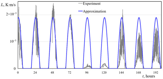 Here, I(z, t) is a kinematic flux in solar radiation, i.e., the radiation heat flux divided by the water density and specific heat. In our calculations, the volumetric heat source is added to the energy equation for the incompressible fluid (∂I/∂z). The radiation heat flux at the ice-water interface Is is a periodic function modeled by approximation of the observational data. These data were obtained during measurements in Lake Vendyurskoe in the spring of 2020. The approximation law for Is is Is(t) = I0·max(sin(2πt/T*), 0), where T* = 24 h is the diurnal period (Figure 2).