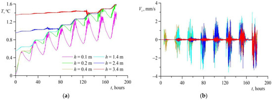 Figure 3a shows the water temperature evolution at different monitoring points located at different depths, h, in Variant 1. In the first few hours, the near-ice water layer warmed up, and convective motion arose due to gravitational instability. At this stage, a CML with intensive turbulent motion began to develop; its temperature was almost spatially constant. The CML depth and temperature increased over time until the end of daily radiative heating (first 12 h). When heating stopped (12–24 h), the convective motion also nearly stopped. The water closest to ice cooled down, and the upper part of the CML re-stratified. Figure 3a clearly illustrates a temperature decline at 0.1 and 0.3 m depths in the upper part of the CML during the “night” hours; at the same time, the temperature at other depths within the CML did not decrease. With the beginning of radiation heating the next day, the temperature at these two upper depths rose and became “re-involved” in the CML. As can be clearly seen from Figure 3a, this cycle recurred every night. It appears that the thickness of the under-ice gradient layer increased when the external energy pump was removed, and decreased when the pump returned. A similar pattern of water temperature change during night hours was observed at the boundary of the under-ice gradient layer and the CML in Lake Onega in the spring of 2017 [42]. These diurnal changes can be interpreted as a balance between vertical diffusion and the buoyancy flux [40,42].