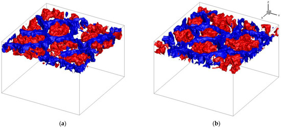 Previously, it was suggested that a community of convective cells may exist inside a CML [45,46,55]. In our simulations, we also observed similar large-scale structures within the CML. To better visualize such structures, the isosurfaces of the positive and negative values of the vertical velocity component are shown in Figure 4a,b for two different days of Variant 2. It is evident that the upstream motion concentrated inside cells, whereas the downstream motion dispersed around these cells. Taking into account the length of the computational domain (9.6 m), the horizontal size of these cells can be several meters (about 3 m). It can also be seen that these cells are long-lived, and can travel in the horizontal direction, become disrupted, and re-emerge again. Similar behavior of large-scale coherent structures was reported in [56,57] in the context of Rayleigh–Bénard-type free convection.