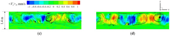 Figure 4c,d show the distributions of the time-averaged (by one hour) vertical velocity component, as well as the streamlines. One can see that these large-scale cells span the entire depth of the CML; thus, we can conclude in the considered case that free convective motion of the Rayleigh–Bénard-type takes place. Similar large-scale convective cells have been observed in our observational studies (e.g., see [55,57]).